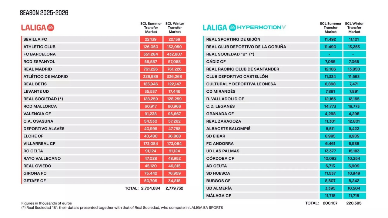 莱万特的工资帽仅有1744万欧元,排名西甲垫底,塞维利亚的工资帽为2213万欧元,西甲倒数第二。